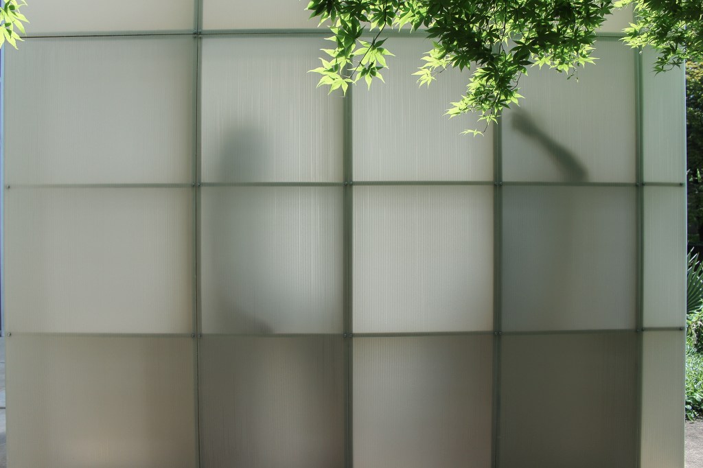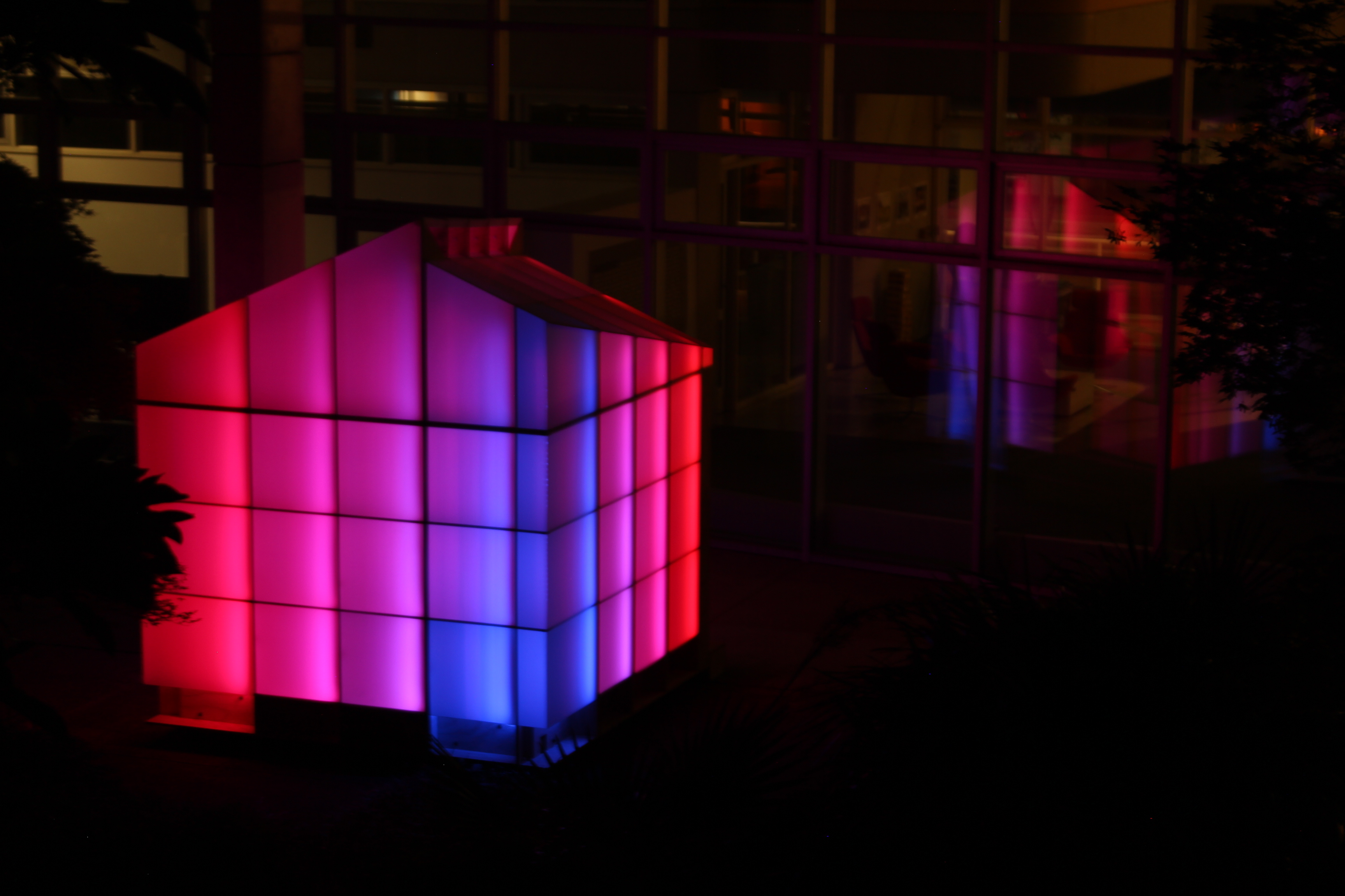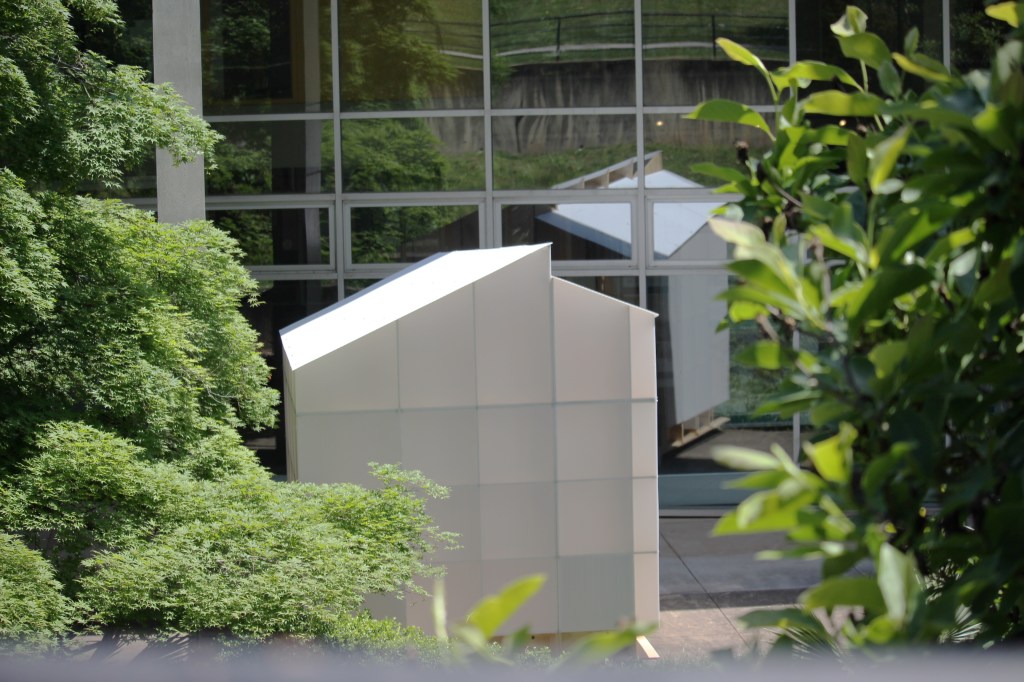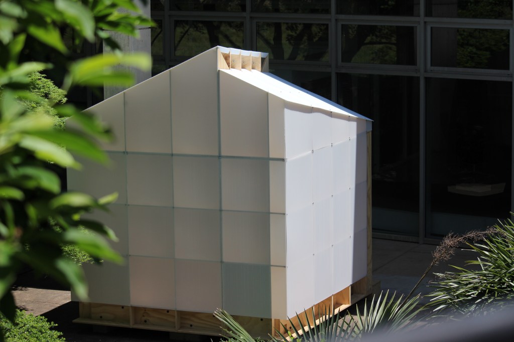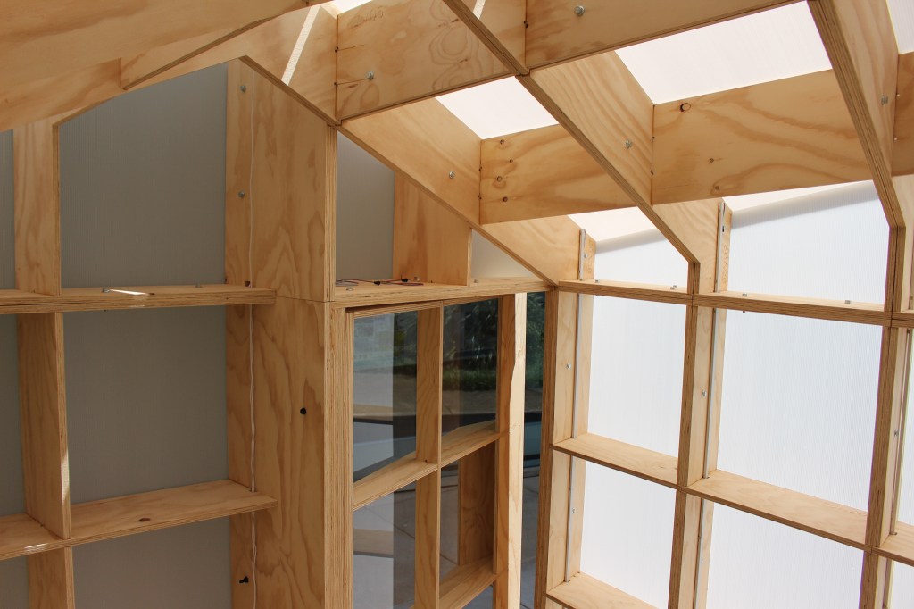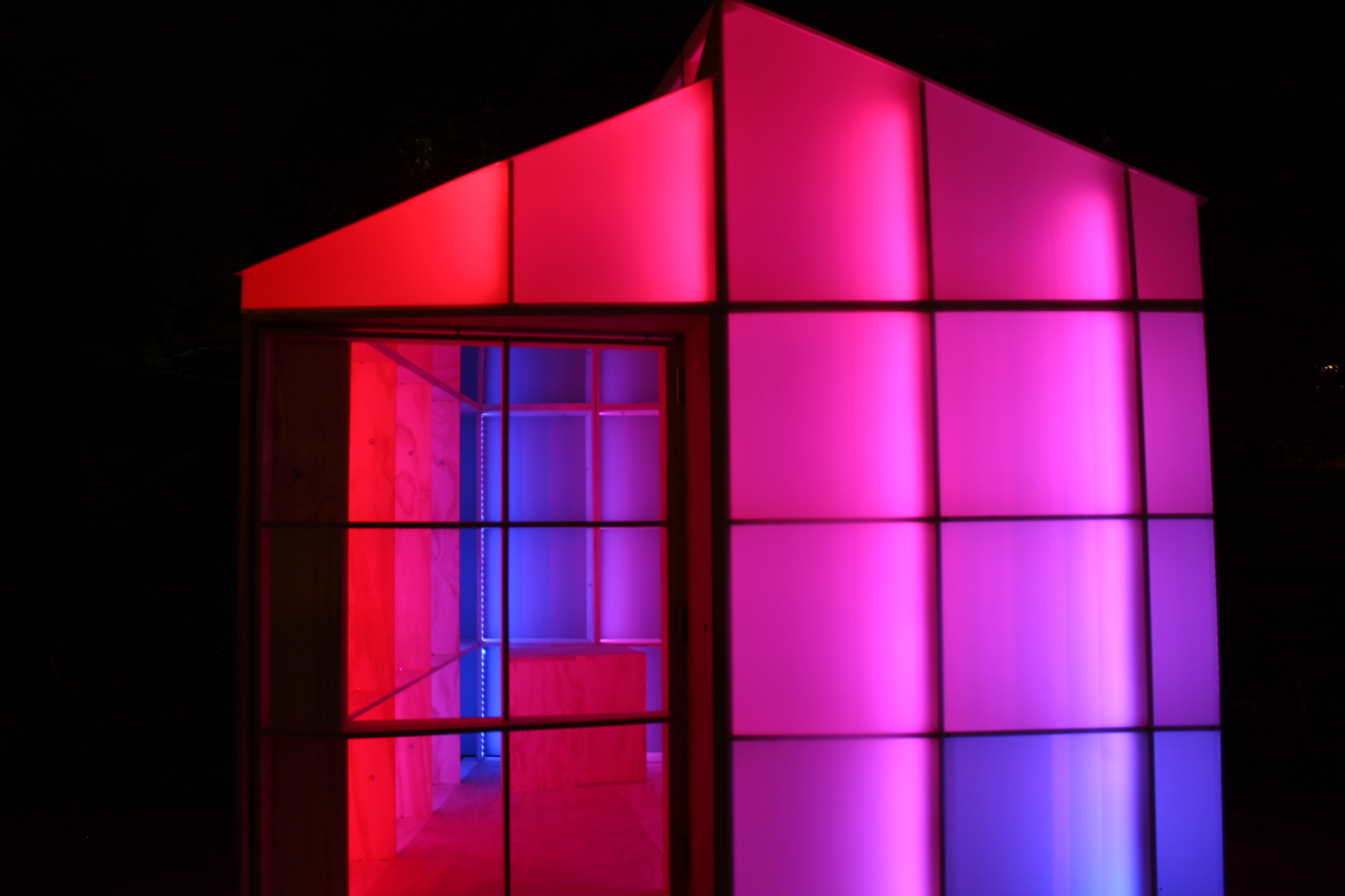 The structure is modeled after the traditional Japanese tea houses, which feature a pitched roof and floor system that allow for cross ventilation. The programming of the LED strips have two variables that were assigned data: color for temperature and saturation for humidity.