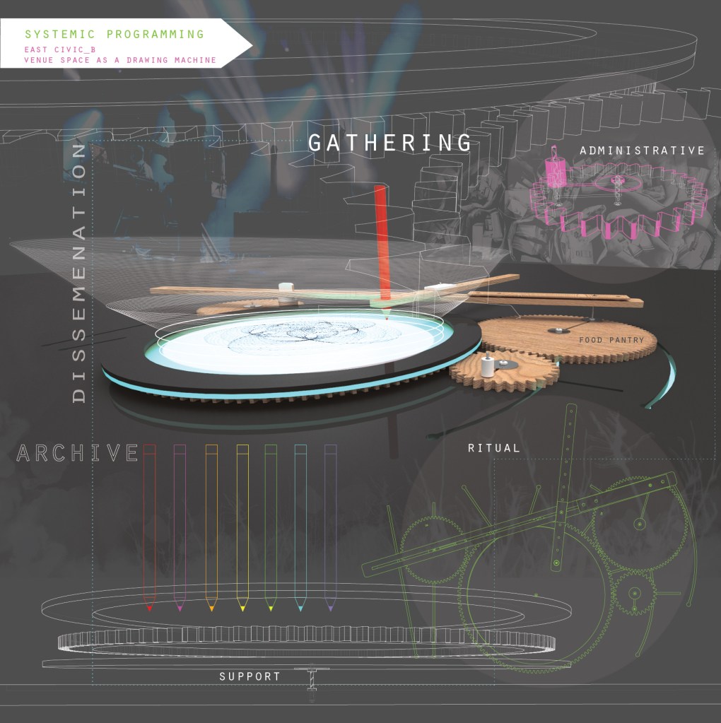The proposal for East Civic B area is a collaborative venue space for aspiring artists and producers that serves as a community space for the various demographics of the east civic center. the proposal combines both, a formal and informal program by allowing the existing site to transform into a playground when an event is not occurring.