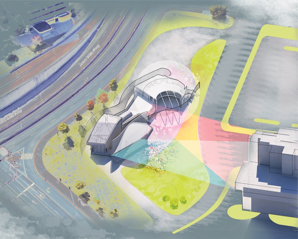 The concept of sampling deals with appropriating elements to assemble a composition through the use of mixing, framing, and overlaying. The Knoxville Chromatik Center mixes hard edges of the sequence of masses along with the curvilinear mesh enclosure to create a fluid, all-inclusive